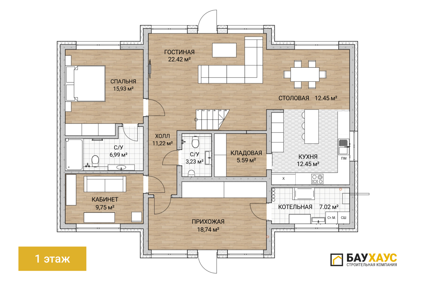Также в доме есть тамбур, тех. помещение и отдельная гардеробная у входа.