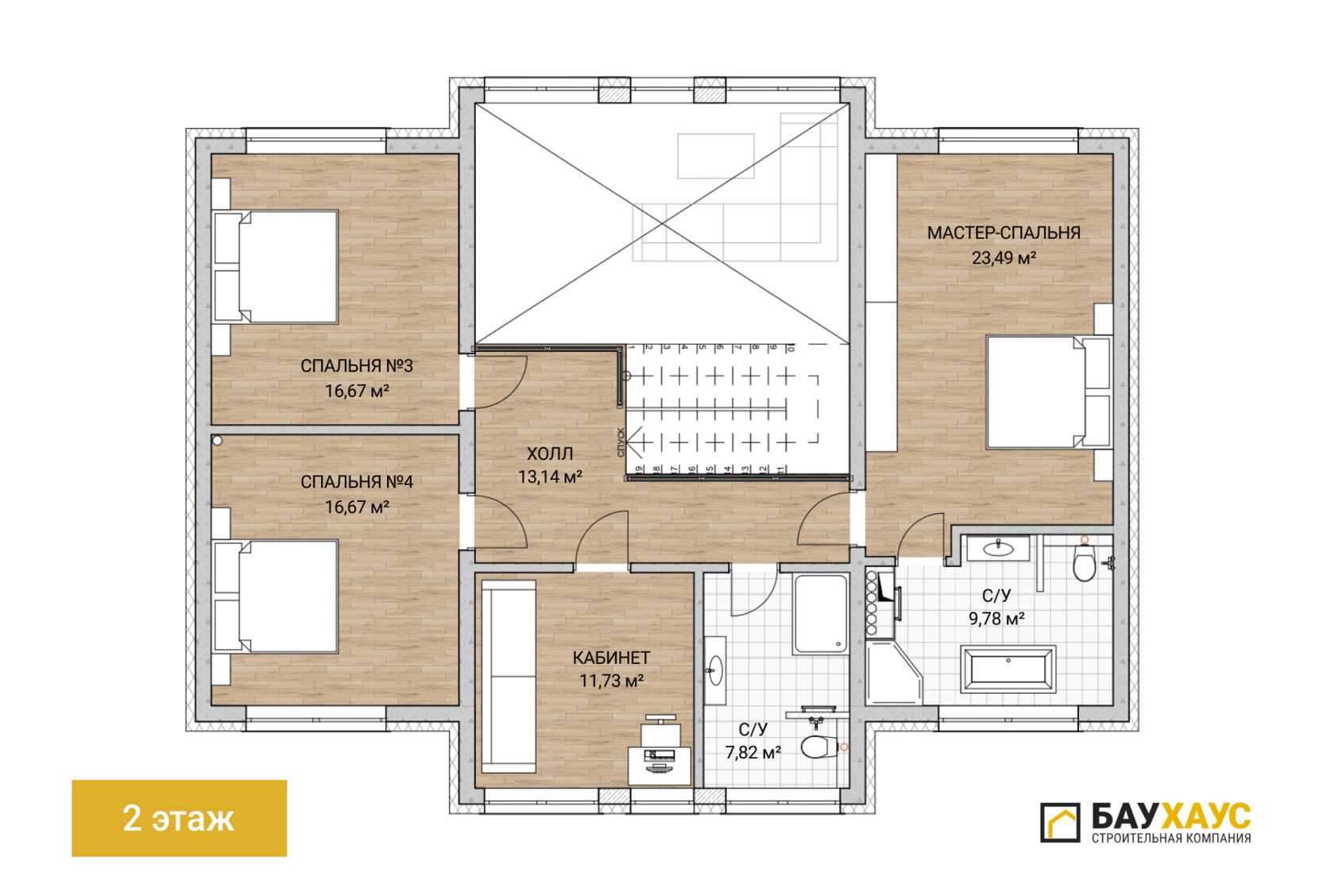 Три спальни, мастер-спальня (17,1 м²) с отдельным санузлом и гардеробной для родителей, а также две детских (12,7 и 12,9 м²).