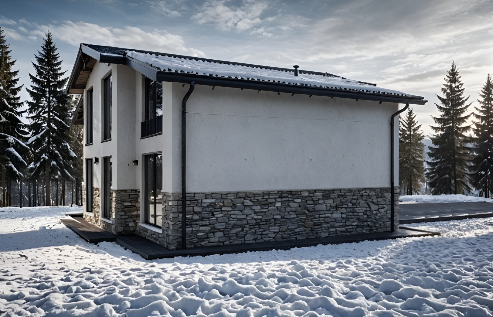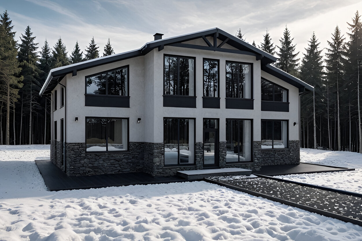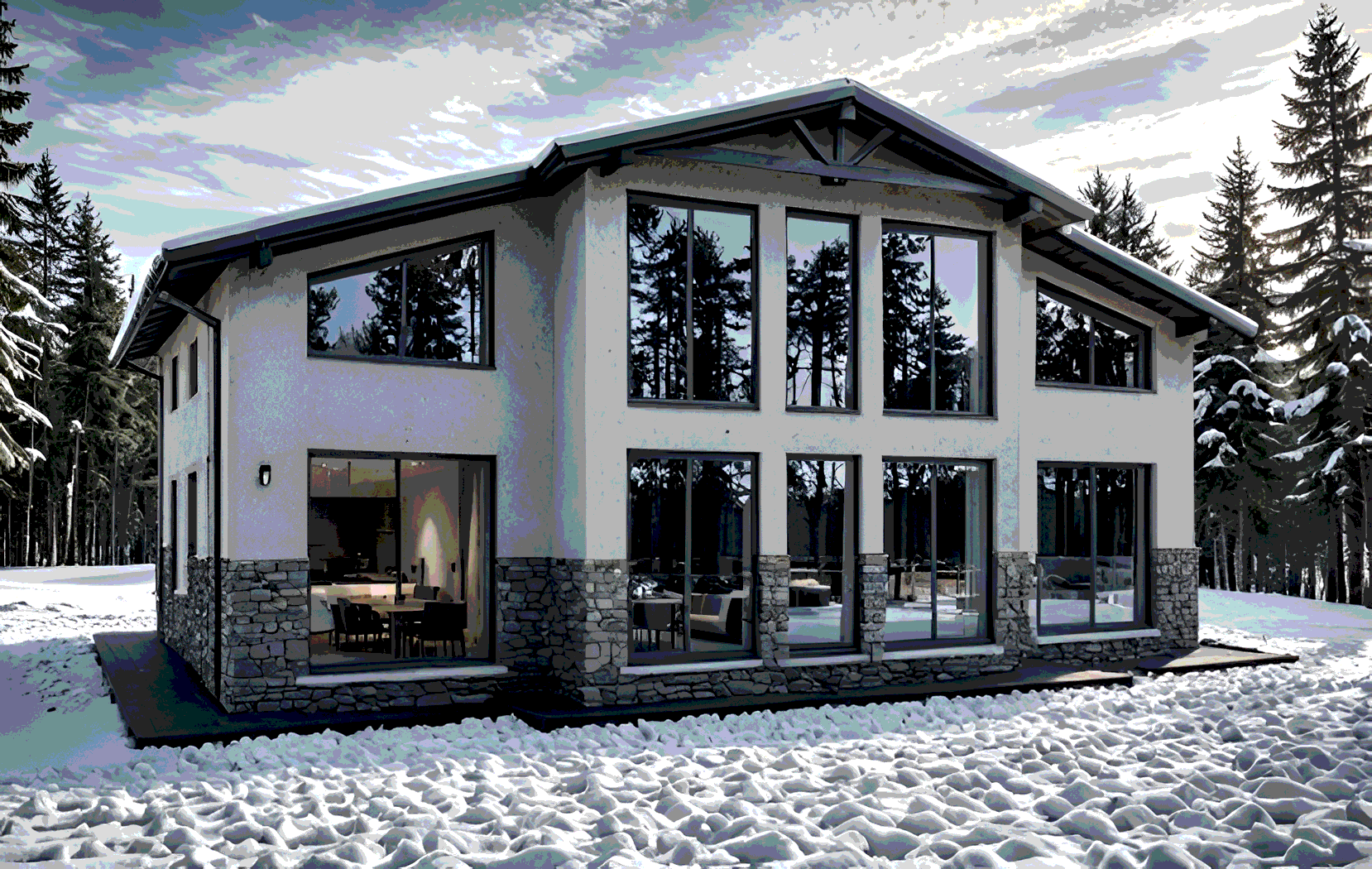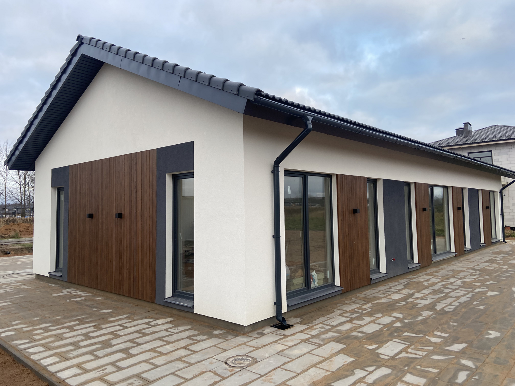 Дом сдан в комплектации "Теплый контур". На фасаде подготовлены ниши под планкен (деревянные вставки), которые будут смонтированы в следующем году по просьбе заказчиков.