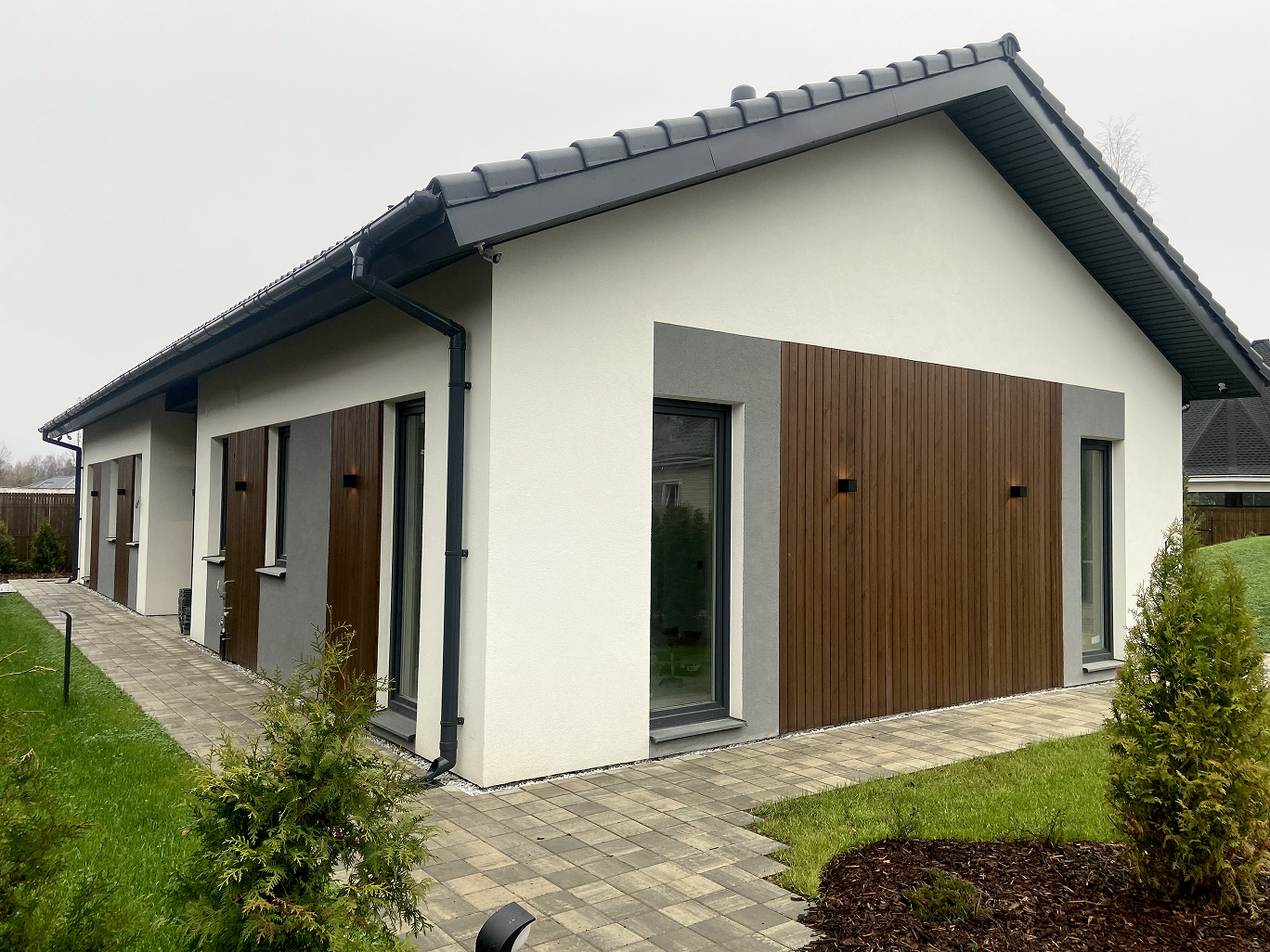 Проект ДСУ 120 — это одноэтажный дом площадью 120 м². Подойдёт семье из 3–4 человек, которая хочет компактный и продуманный дом. Фасад выполнен из светлой камешковой силиконовой штукатурки с вставками из планкена.