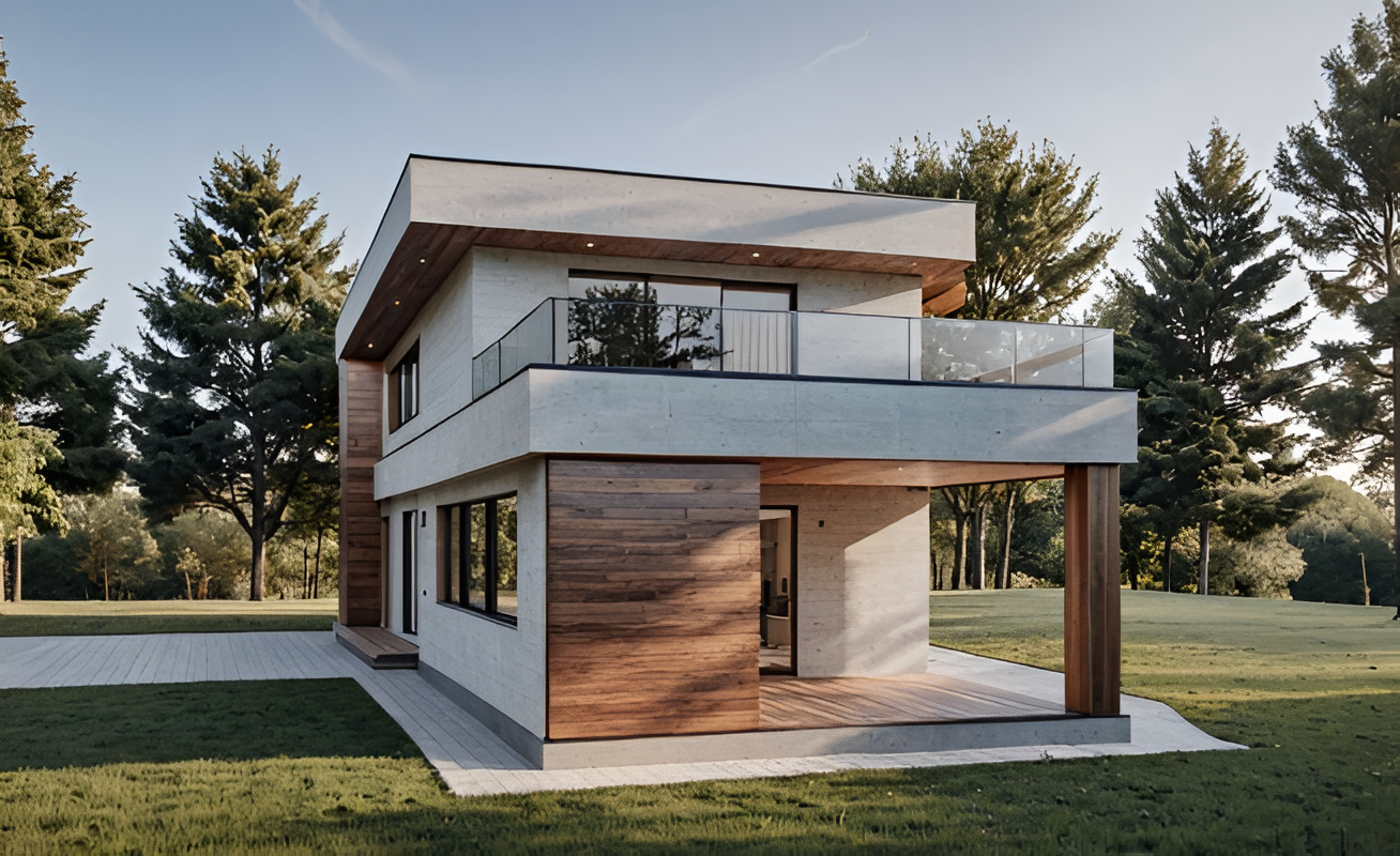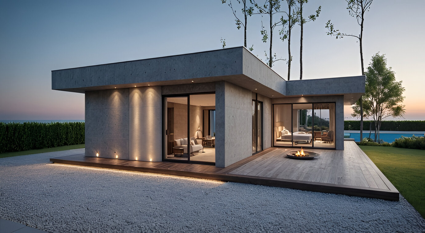 Проект ДСУ 120 — это одноэтажный дом площадью 120 м². Подойдёт семье из 3–4 человек, которая хочет компактный и продуманный дом. Фасад выполнен из светлой камешковой силиконовой штукатурки с вставками из планкена.