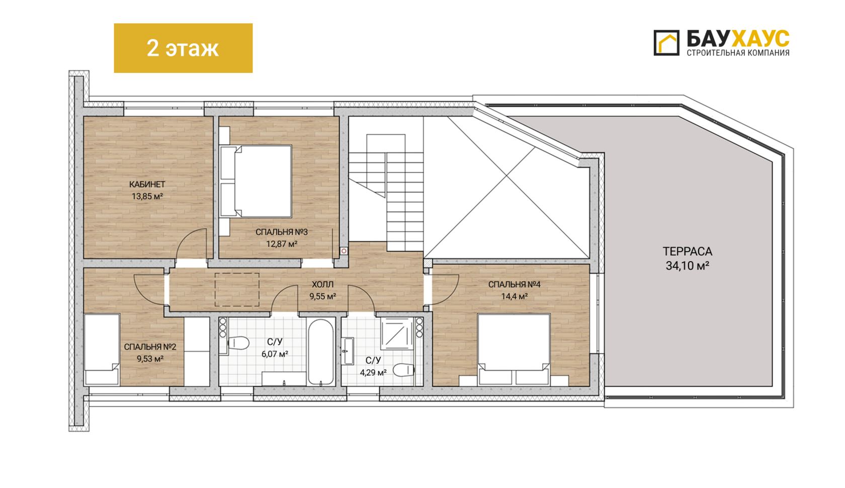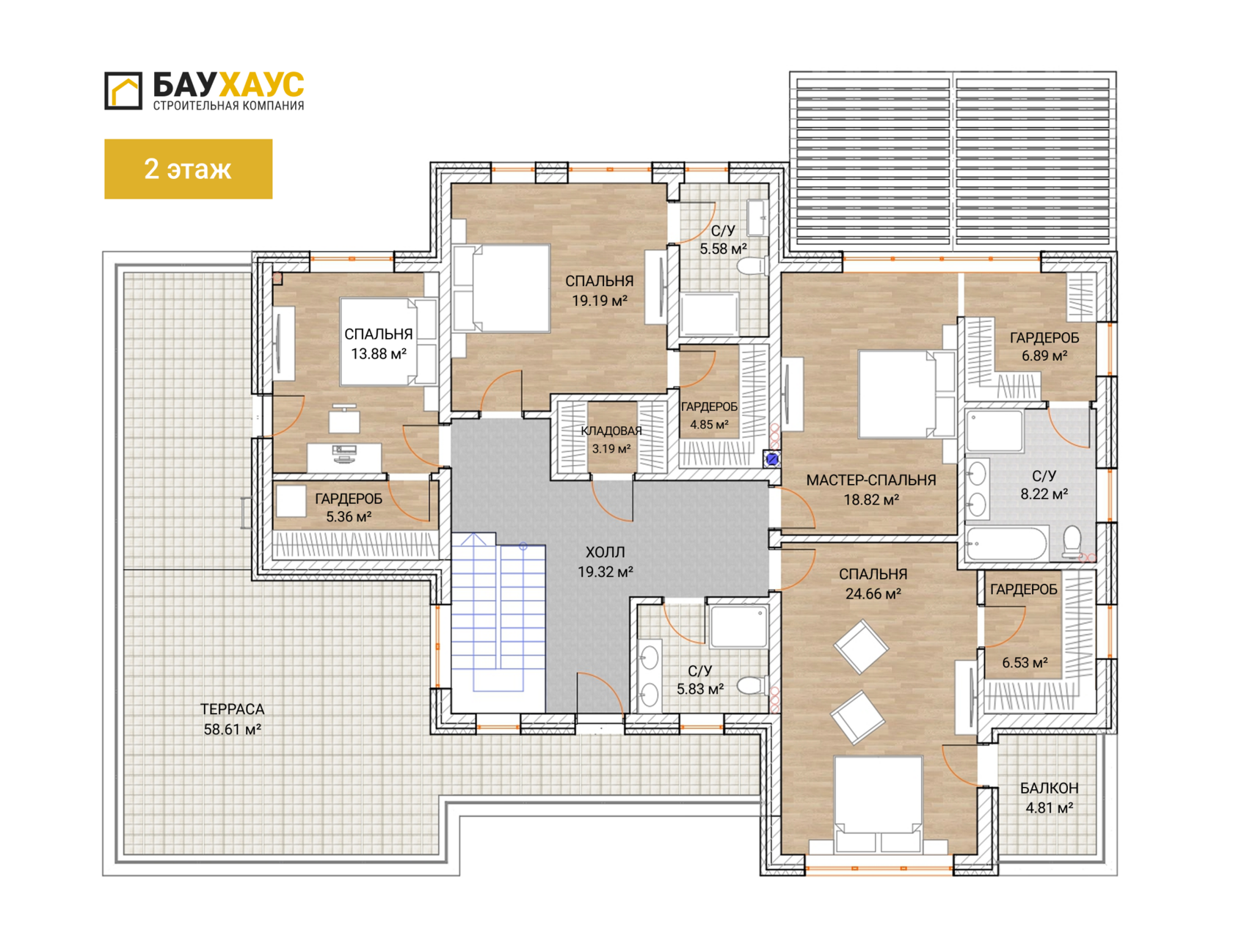 Второй этаж — это приватная зона отдыха для домочадцев.