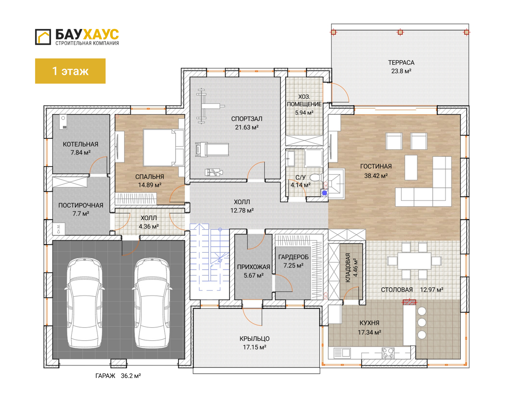 На первом этаже разворачивается вся ваша повседневная и гостевая жизнь. Её сердце — просторная гостиная-столовая с эффектным вторым светом, где под высоким потолком собирается за обедом вся семья и друзья. Рядом — функциональная кухня с большой кладовой, где есть место для всех запасов. Для работы или уединения предусмотрен кабинет, а для гостей — уютная спальня. Удобства продуманы до мелочей: два санузла на первом этаже и вместительная прихожая с гардеробом, где порядок начинается с порога.