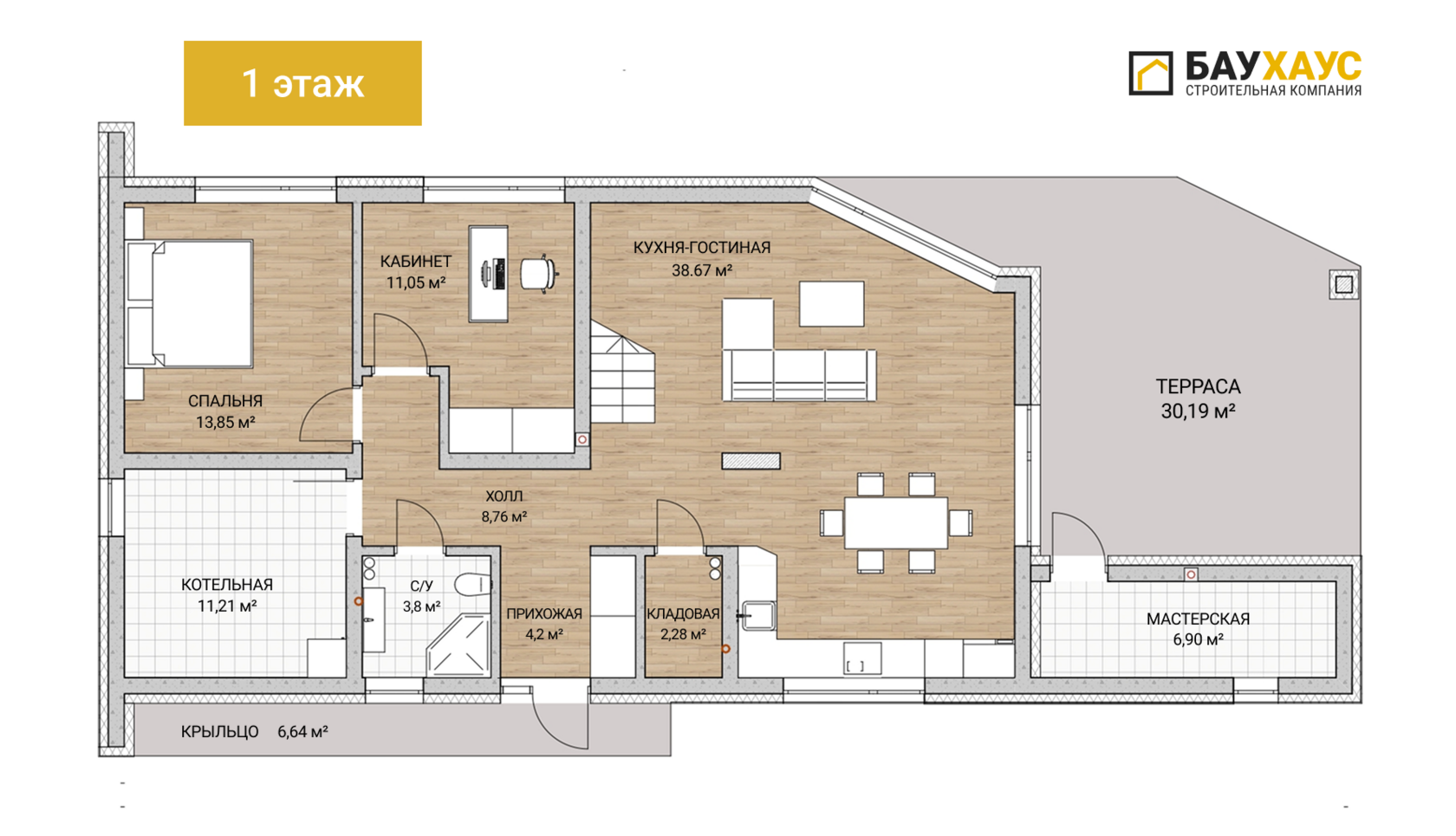 Кухня-гостиная (40,3 м²) — просторное общее пространство с большим обеденным столом и зоной отдыха. Из неё — выход на задний двор.