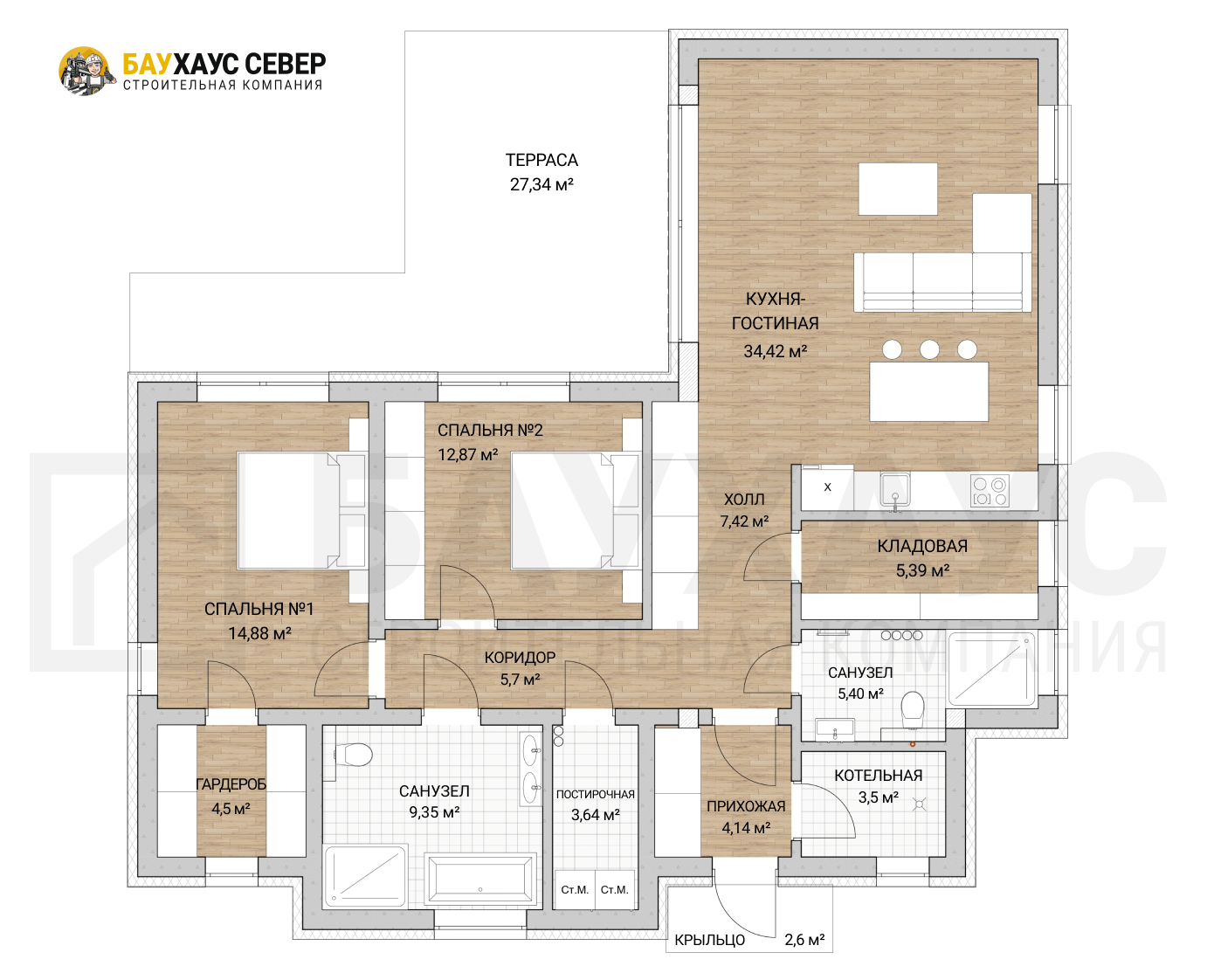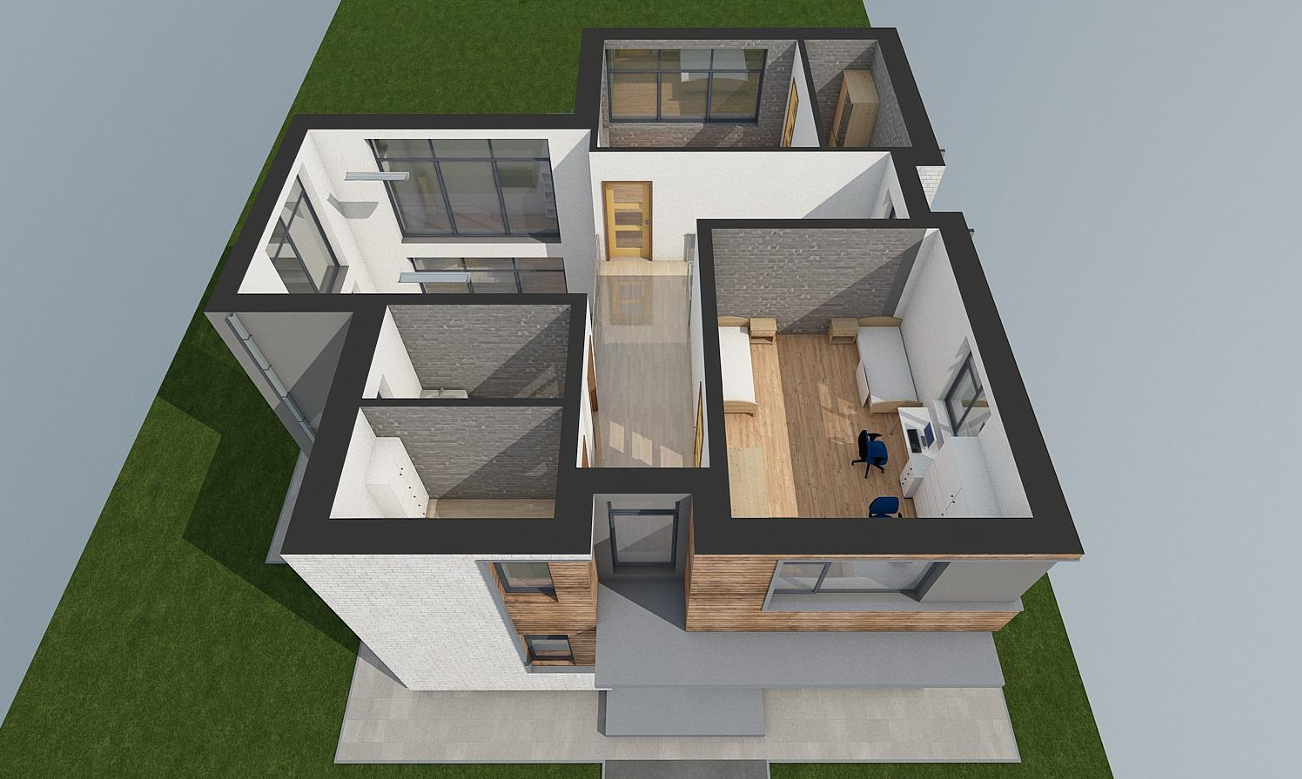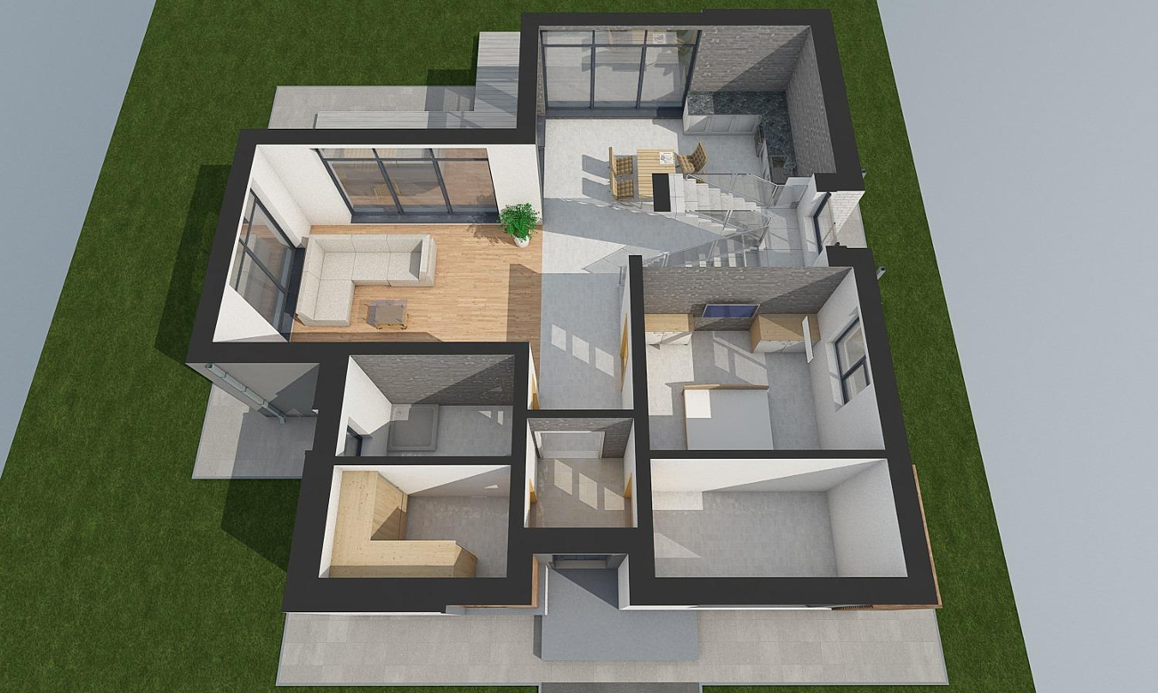 Проект с 4 спальнями, большой кухней-гостиной с выходом террасу.
