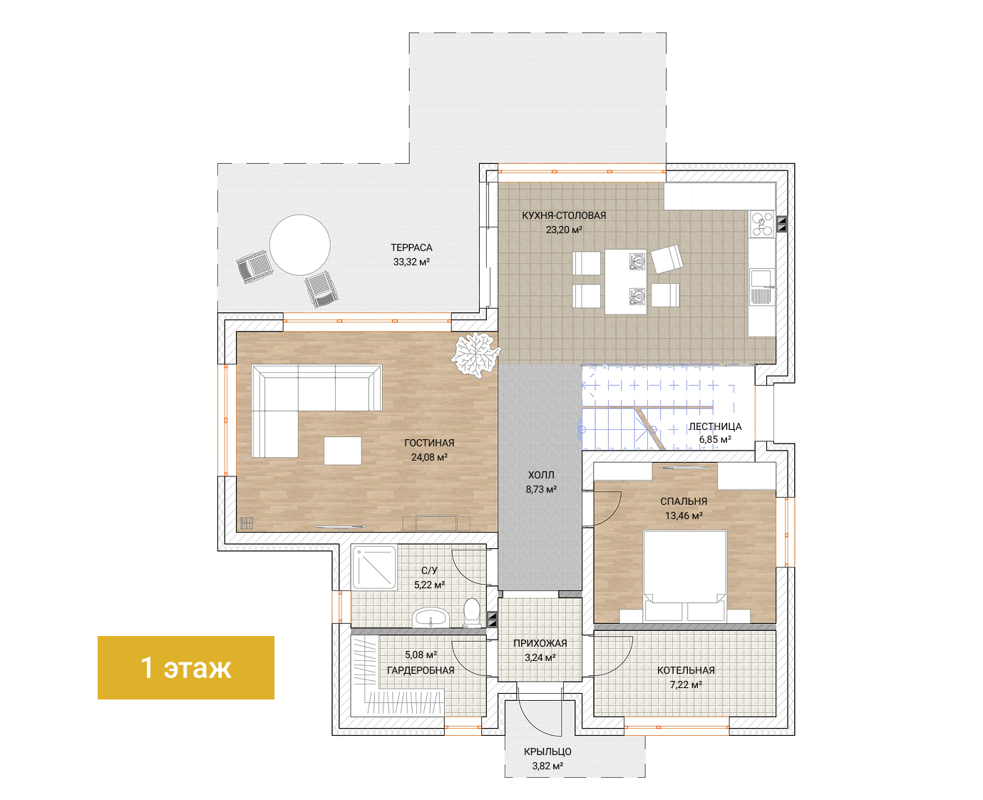 На первом этаже разворачивается вся ваша повседневная и гостевая жизнь. Её сердце — просторная гостиная-столовая с эффектным вторым светом, где под высоким потолком собирается за обедом вся семья и друзья. Рядом — функциональная кухня с большой кладовой, где есть место для всех запасов. Для работы или уединения предусмотрен кабинет, а для гостей — уютная спальня. Удобства продуманы до мелочей: два санузла на первом этаже и вместительная прихожая с гардеробом, где порядок начинается с порога.