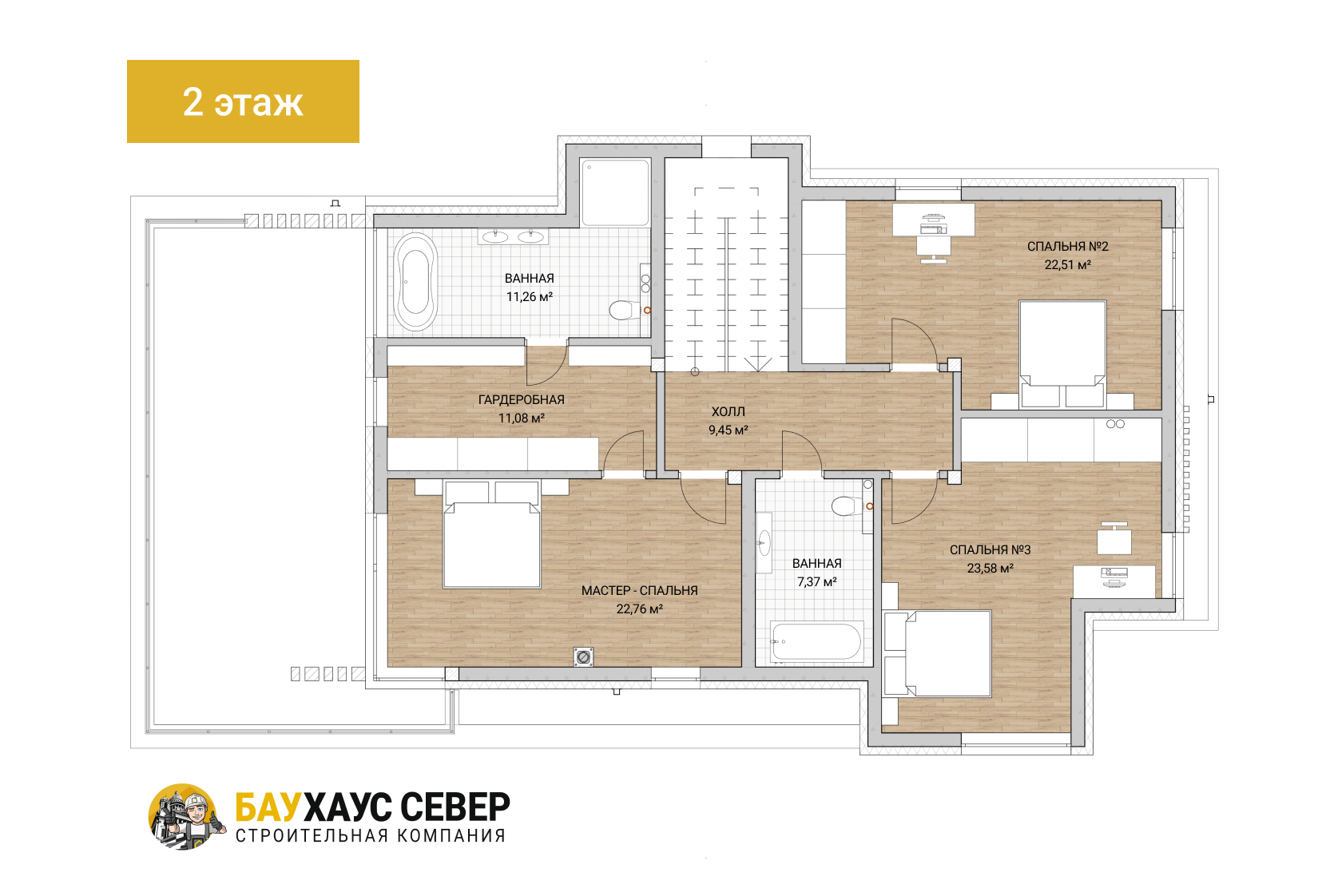 Второй этаж — это приватная зона отдыха для домочадцев. Здесь царит просторная мастер-спальня с собственным санузлом, создающая атмосферу роскошного ретрита. Рядом — две светлые спальни для детей или родных и общий санузел.